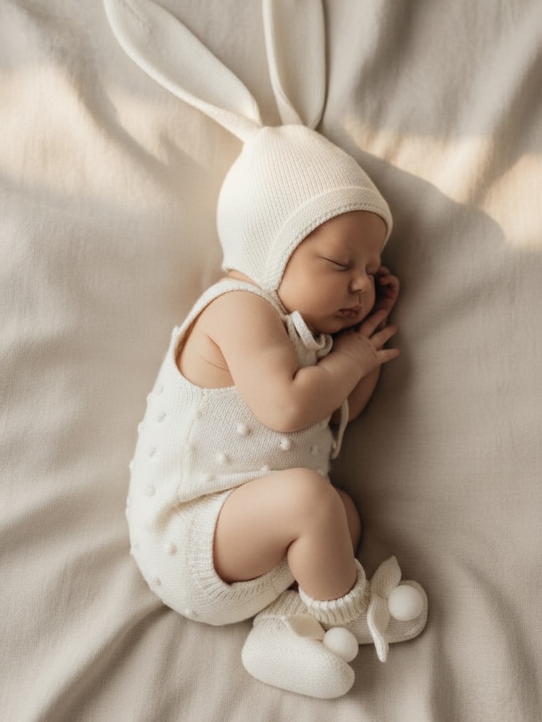 Πλεκτό σετ από εξαιρετικά απαλό, 100% οργανικό βαμβάκι βιολογικής γεωργίας, ειδικά σχεδιασμένο για μικροσκοπικά κουνελάκια. Το σετ περιλαμβάνει φορμάκι με ουρίτσα, παπουτσάκια και σκουφάκι με αυτάκια. Ανάλαφρη πλέξη που επιτρέπει στην ευαίσθητη βρεφική επιδερμίδα να αναπνέει, διατηρώντας σταθερή τη θερμοκρασία του σώματος.