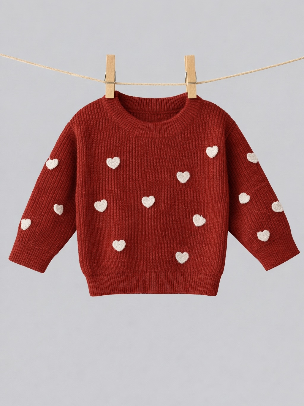 Πλεκτό βρεφικό πουλόβερ σε φλογερό, κόκκινο χρώμα, διακοσμημένο με ανάγλυφες καρδούλες που είναι βέβαιο ότι θα κλέψουν τη δική σας. Ένα κομμάτι που ισορροπεί αρμονικά ανάμεσα στη minimal αισθητική και τη γλυκιά παιδικότητα, ιδανικό για προσεγμένες και κομψές εμφανίσεις.