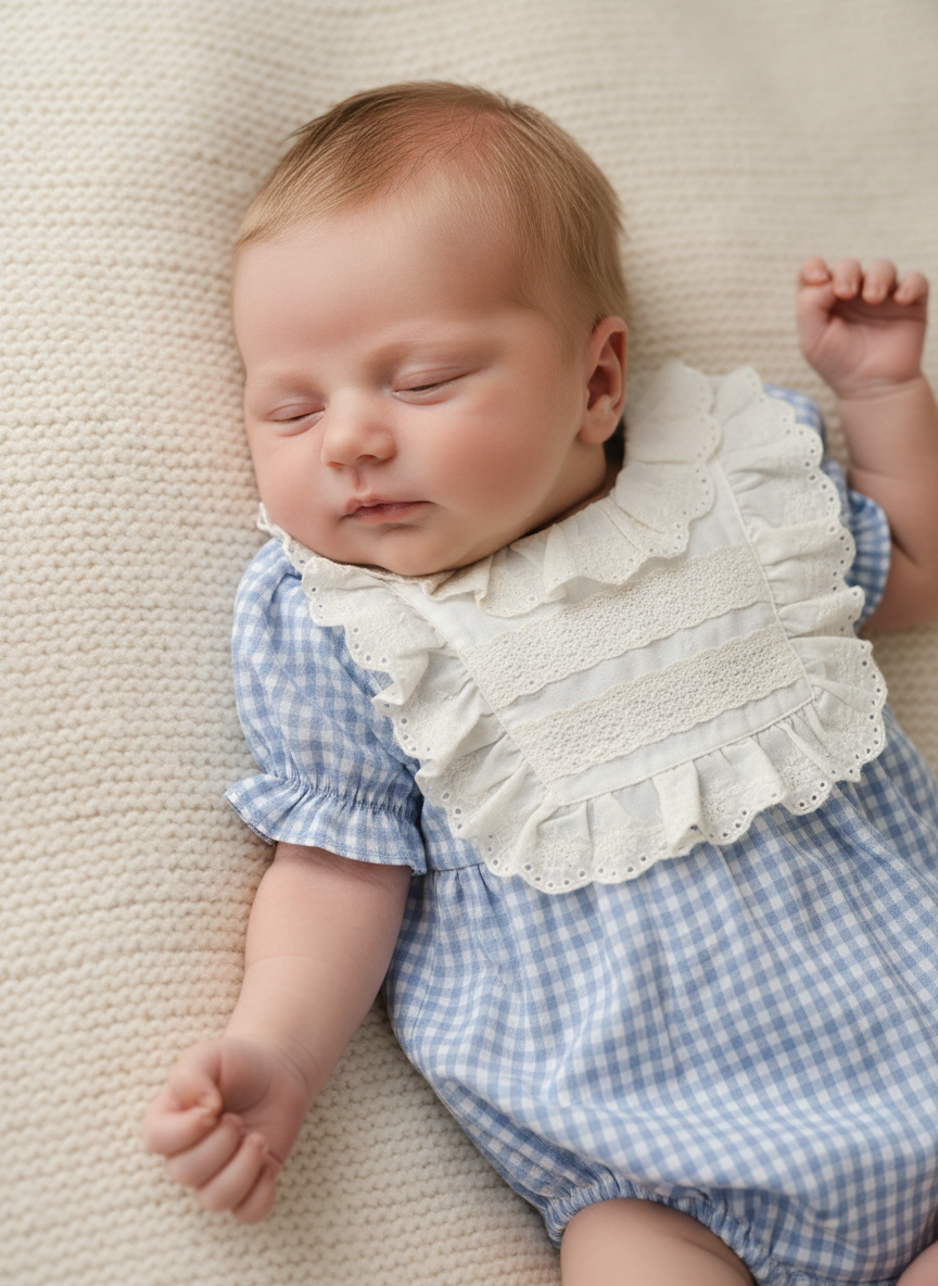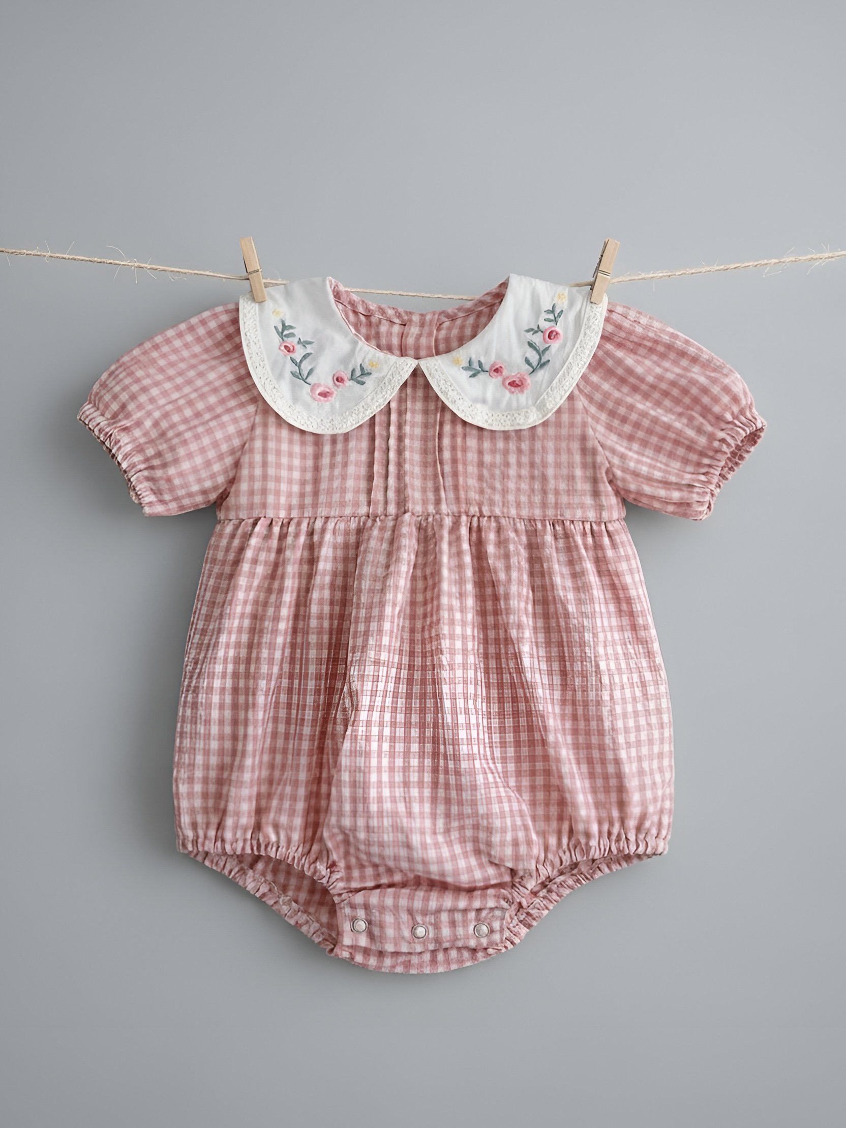 Το απαλό καρό ύφασμα, σε συνδυασμό με τον κεντημένο γιακά, χαρίζει διαχρονική κομψότητα και τρυφερότητα στις πρώτες εμφανίσεις του μωρού σας.