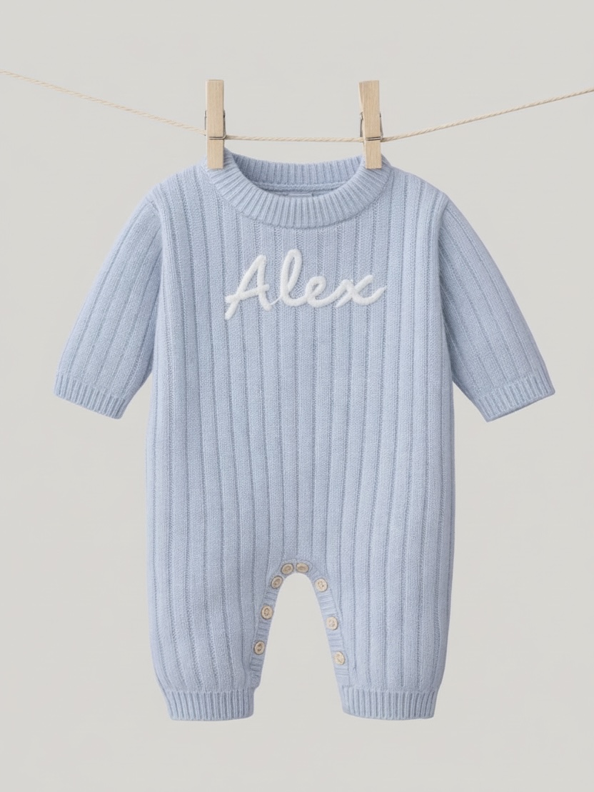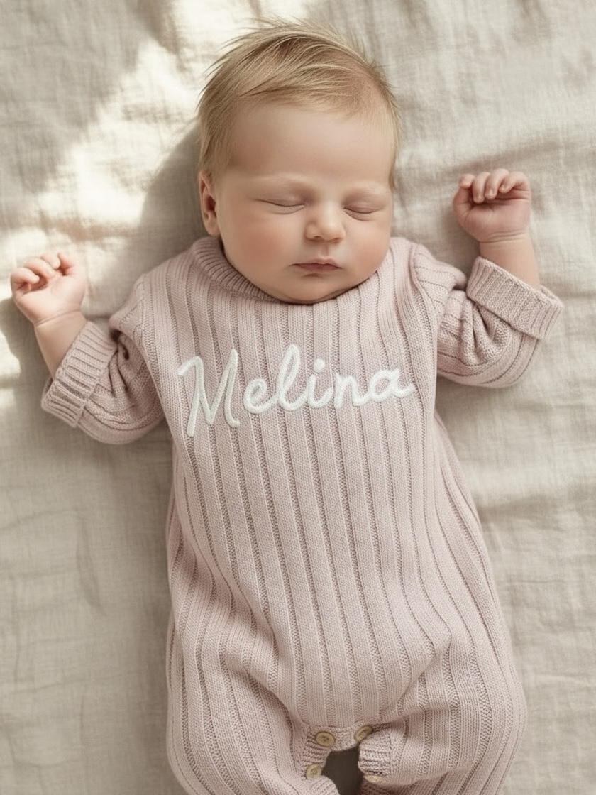 Ολόσωμο, χειροποίητο πλεκτό φορμάκι από εξαιρετικά απαλό, 100% οργανικό βαμβάκι, κεντημένο με το όνομα του μωρού σας.