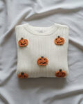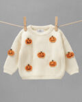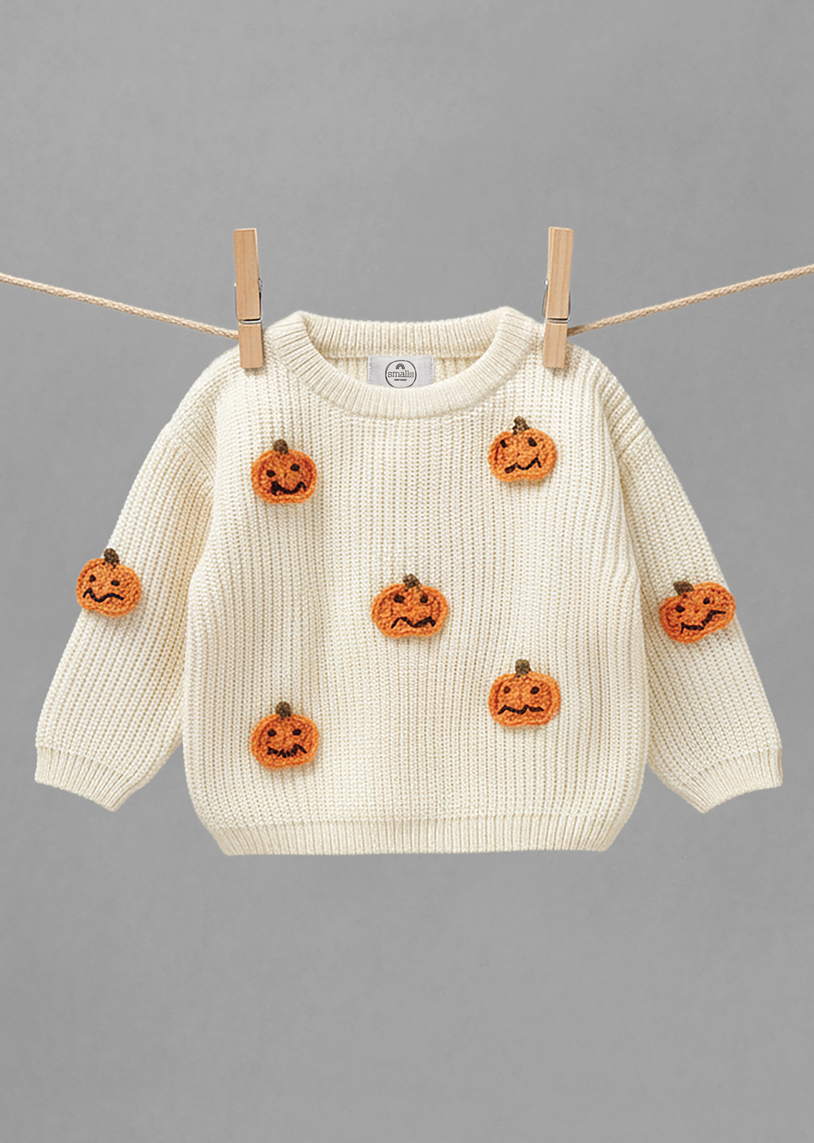 Χειροποίητο πλεκτό πουλόβερ από 100% οργανικό βαμβάκι σε μπεζ απόχρωση, διακοσμημένο με κεντημένες πορτοκαλί κολοκύθες. Κατασκευασμένο από εξαιρετικά απαλό, αναπνεύσιμο νήμα, είναι απόλυτα φιλικό προς το ευαίσθητο παιδικό δέρμα και χαρίζει άνεση και στυλ όλη μέρα. Το παιχνιδιάρικο σχέδιο με τις μικρές κολοκύθες το κάνει ιδανικό για cozy φθινοπωρινές εμφανίσεις, οικογενειακές βόλτες ή γιορτινές φωτογραφίες με seasonal διάθεση.