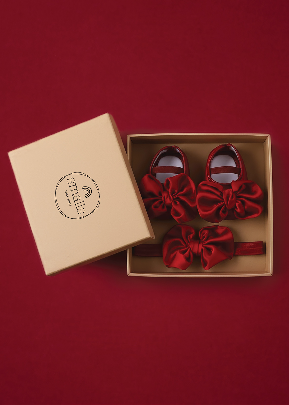 Σετ δώρου για το νεογέννητο κοριτσάκι, με παπουτσάκια αγκαλιάς και κορδέλα σε γιορτινό, κόκκινο χρώμα. Κατάλληλο από τη γέννηση.