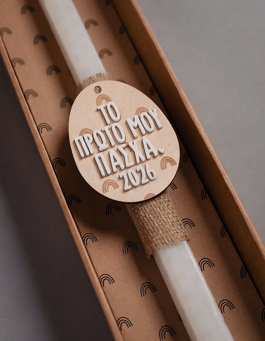Πασχαλινή λαμπάδα με χειροποίητο, ξύλινο διακοσμητικό με το μήνυμα “Το Πρώτο μου Πάσχα” από τη limited edition συλλογή Smalls Easter Collection. Διατίθεται σε εορταστική συσκευασία δώρου. Καλό Πάσχα!