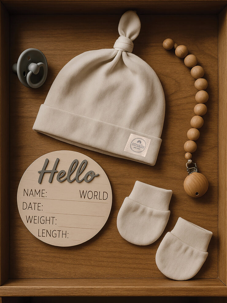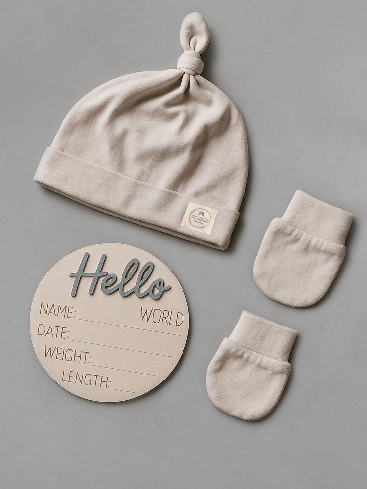 Σετ δώρου για νεογέννητο αγοράκι, με σκουφάκι, βρεφικά γαντάκια και ξύλινο αναμνηστικό γέννησης, ιδανικό για το μαιευτήριο ή το babyshower.