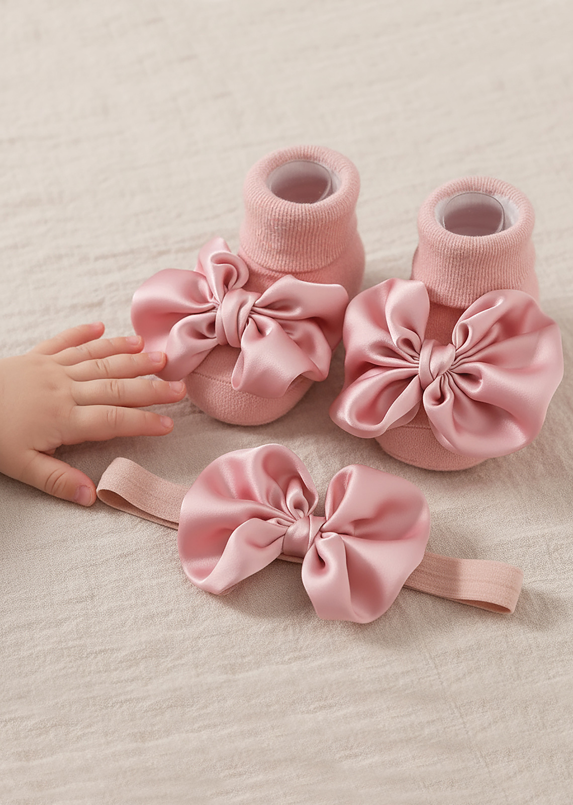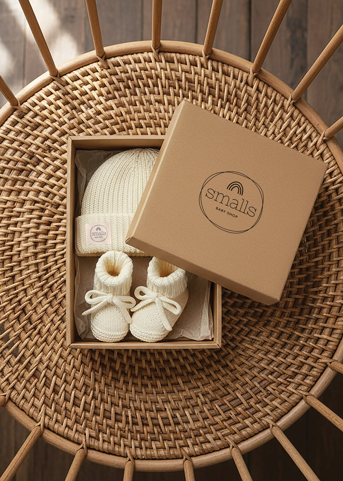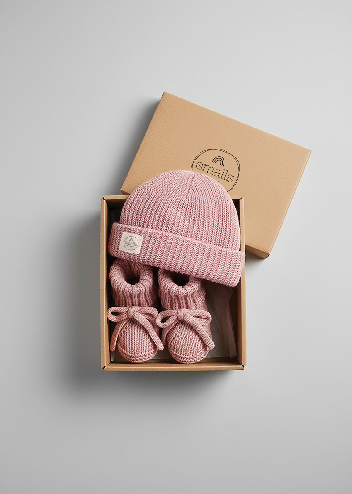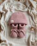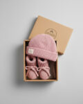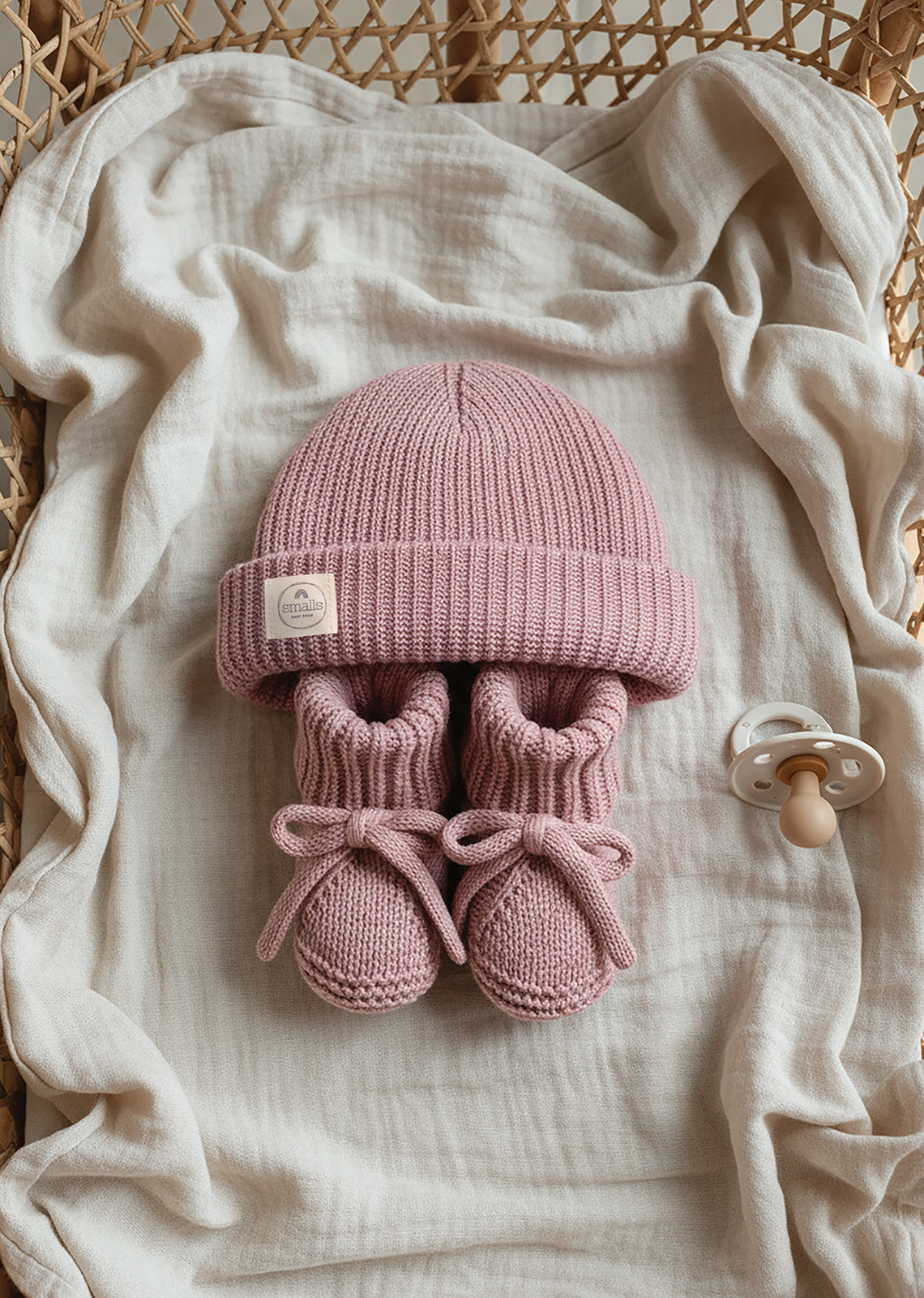 Σετ δώρου για το νεογέννητο μωράκι με πλεκτό σκουφάκι και παπουτσάκια από εξαιρετικά απαλό, 100% οργανικό βαμβακερό νήμα βιολογικής γεωργίας στο χρώμα της πούδρας. Απαραίτητο σετ για το νεογέννητο βρέφος και ιδανικό δώρο για τους νέους γονείς.