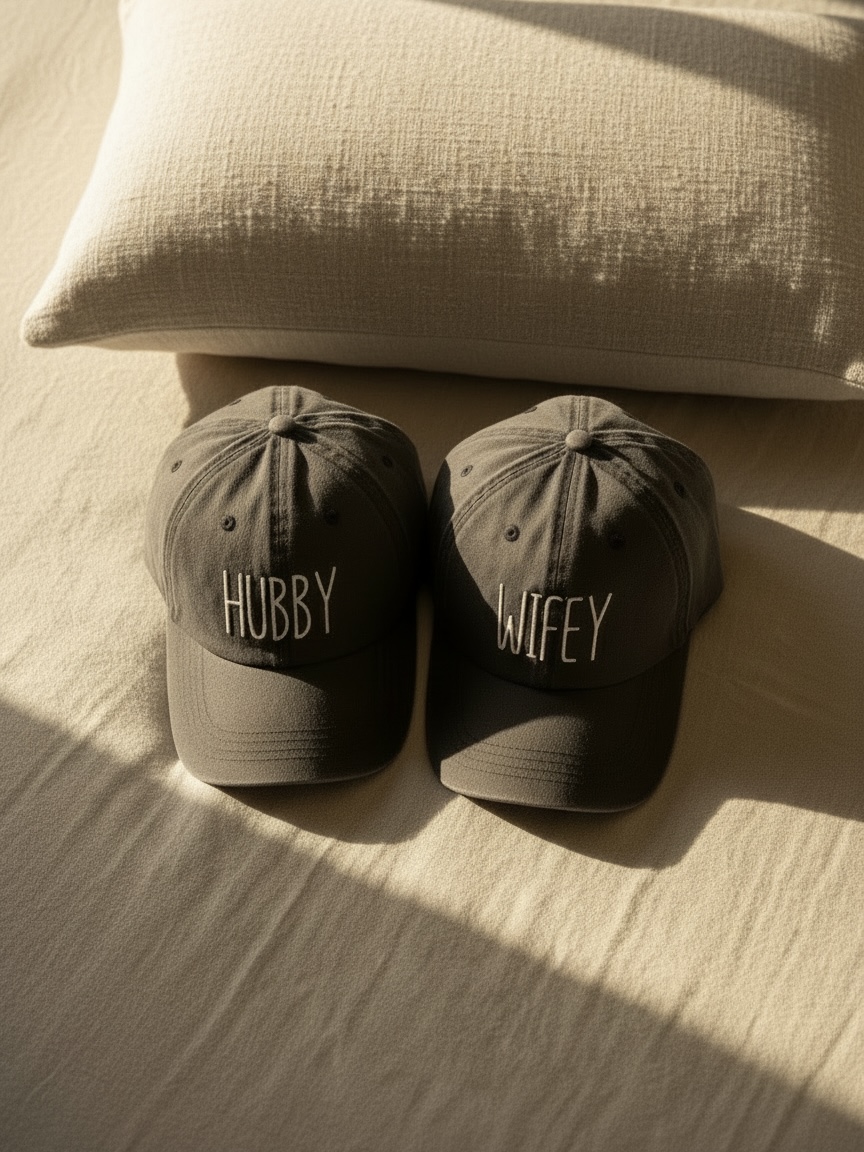 Σετ από 2 υφασμάτινα καπέλα με ρυθμιζόμενο λουράκι στο πίσω μέρος, ειδικά σχεδιασμένα για τον σύζυγο και τη σύζυγο.