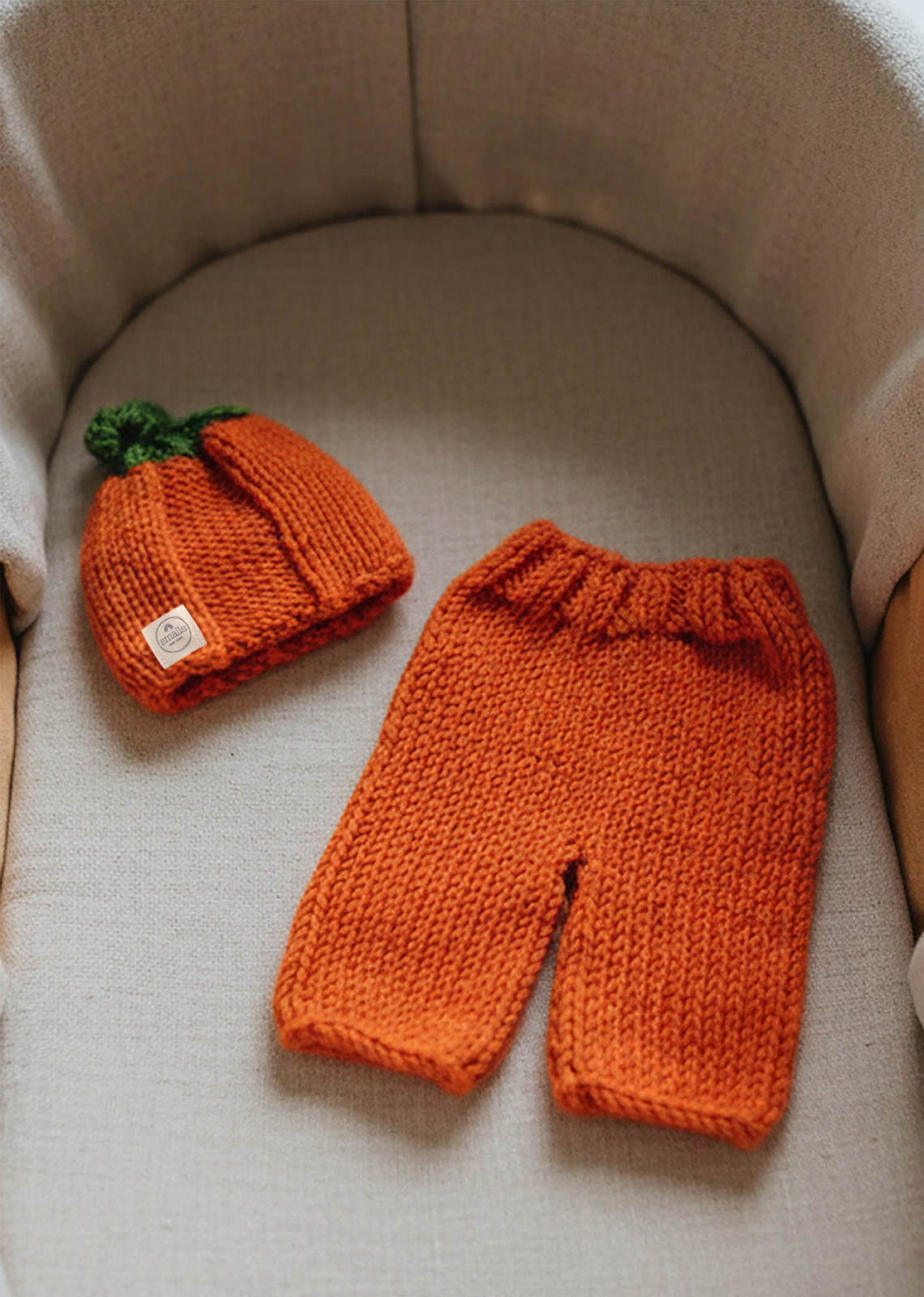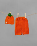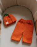 Χειροποίητο βρεφικό σετ δύο τεμαχίων με σκουφάκι και παντελόνι σε πορτοκαλί χρώμα , κάνουν το μωράκι να μοιάζει με χαριτωμένη μικροσκοπική κολοκύθα. Ιδανικό για autumn babies και newborn φωτογραφίες. Προϊόν ελεγμένο για βλαβερές ουσίες και πιστοποιημένο σύμφωνα με το πρότυπο OEKO-TEX Standard 100.